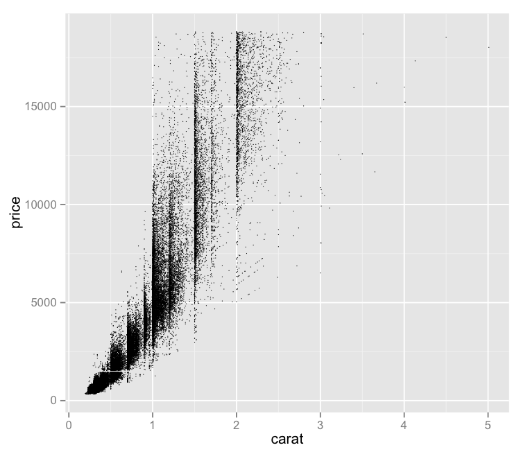qplot(carat, price, data=diamonds, size=I(1/3))