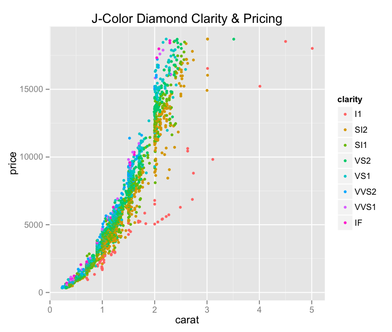 j <- j + ggtitle("J-Color Diamond Clarity & Pricing")