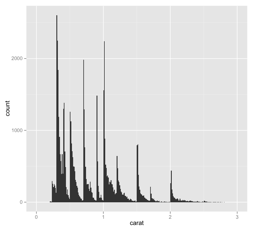 library(ggplot2) qplot(carat, data=diamonds, geom="histogram", binwidth=.01, xlim=c(0,3))