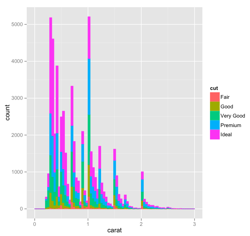 library(ggplot2) qplot(carat, data=diamonds, geom="bar", fill=cut, binwidth=.04, xlim=c(0,3))