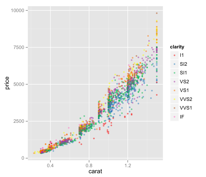 library(ggplot2) jsmall <- subset(diamonds, color=="J" & carat <= 1.5) plot.j.small <- qplot(carat, price, data=jsmall, color=clarity, size=I(1.5), alpha=I(.5)) plot.j.small + scale_color_brewer(palette="Set1")