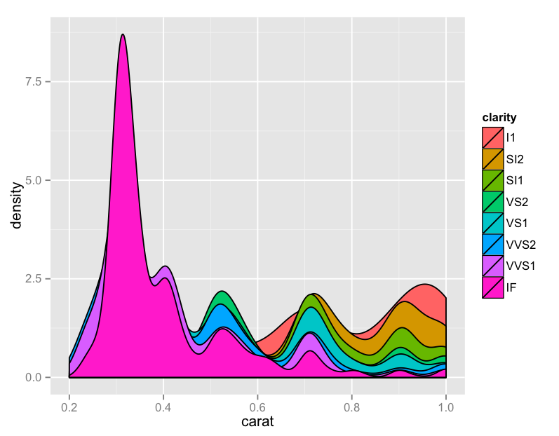 library(ggplot2) jsmaller = subset(diamonds, color="J", carat <= 1) plot.jsmaller = qplot(carat,data=jsmaller,fill=clarity, binwidth=.01, geom="density") plot.jsmaller + scale_color_brewer(palette="Set1")