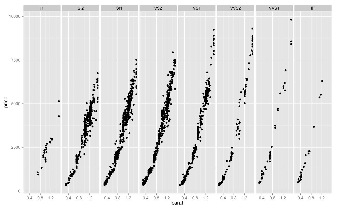 > library(ggplot2) > jsmall <- subset(diamonds, color=="J" & carat <= 1.5) > j.facet <- ggplot(jsmall, aes(carat, price)) + geom_point() > j.facet + facet_grid(. ~ clarity)